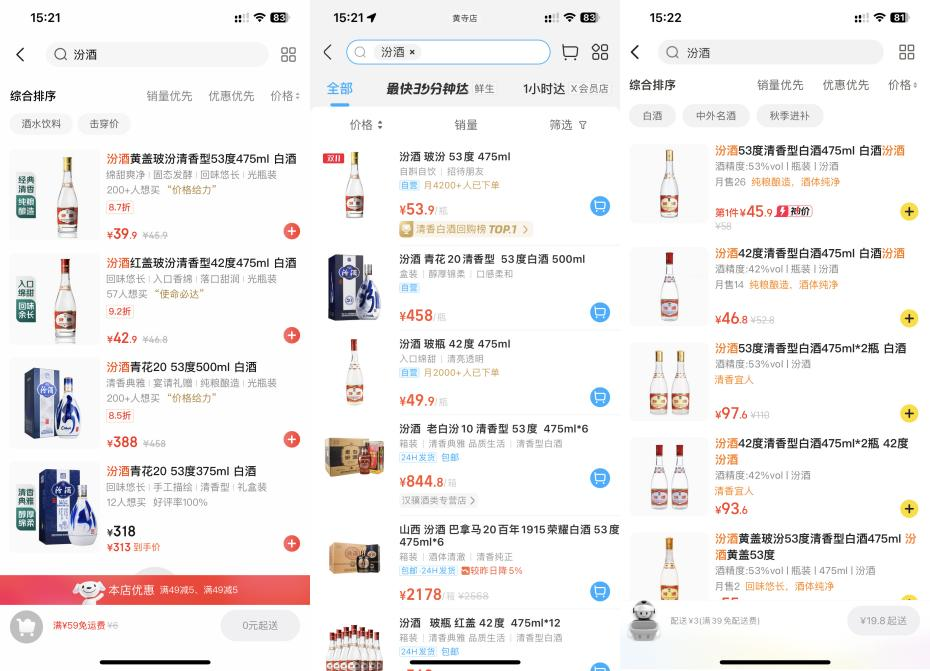 53度475ML的黃蓋玻汾,京東七鮮售價39.9元,盒馬售價53.9元,小象超市售價45.9元。