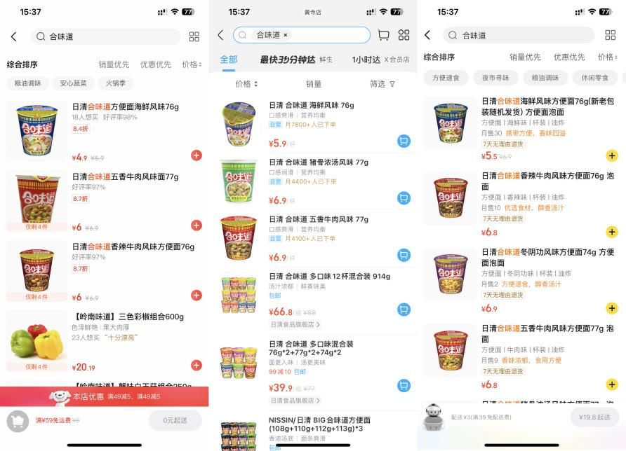 76克的日清合味道方便面,京東七鮮賣4.9元,盒馬5.9元,小象超市5.5元。