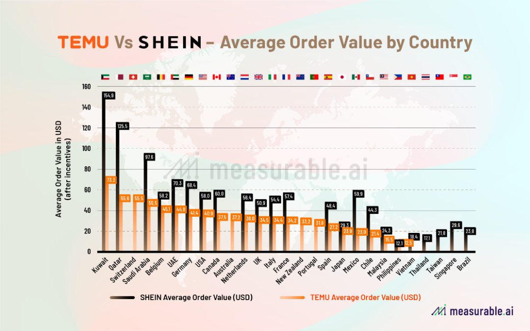 Shein、Temu 客單價(jià)對(duì)比,圖片來源:Measurable AI