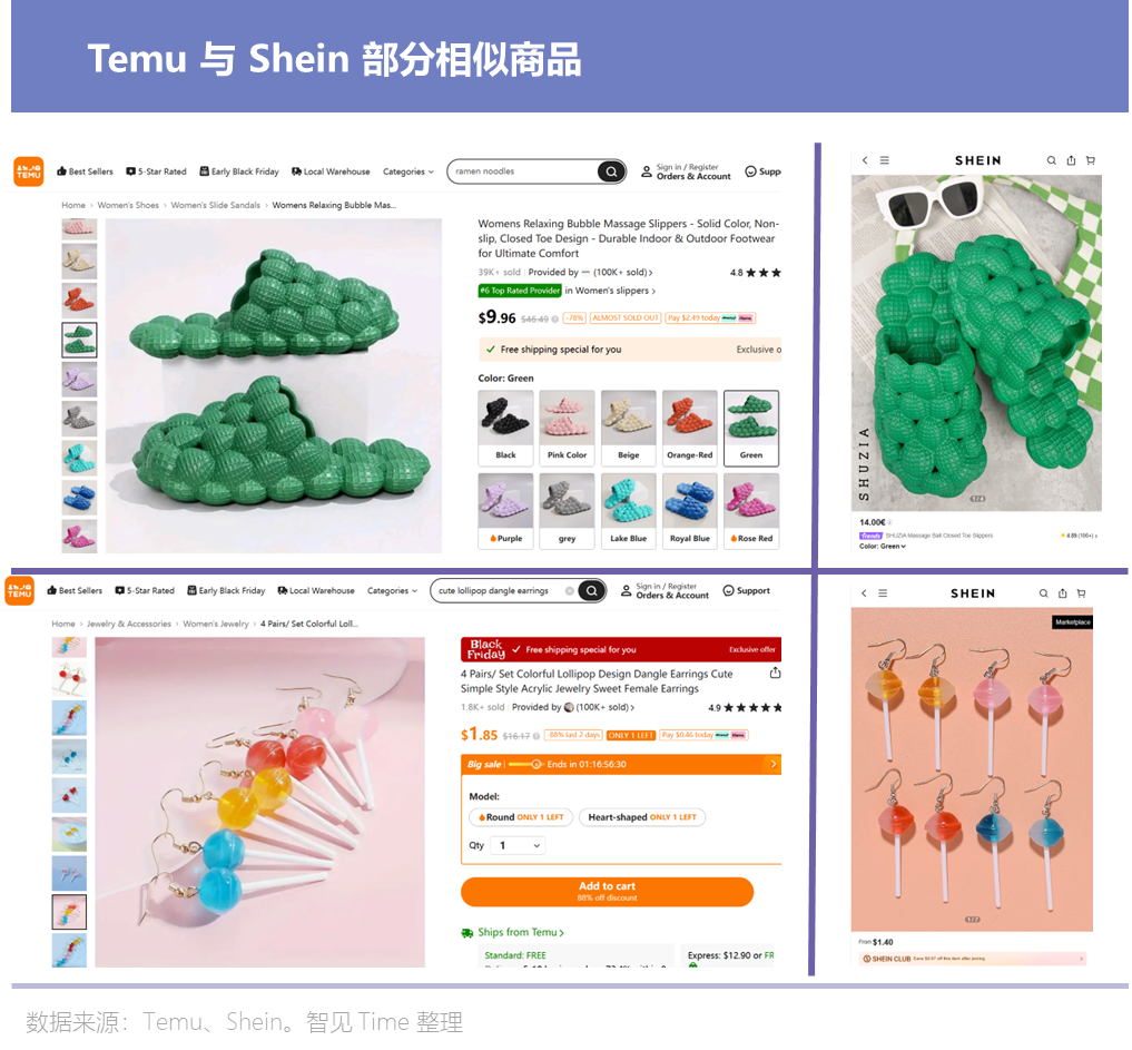 當(dāng)然 Shein 的商品并沒有比 Temu 的在質(zhì)量、款式等方面有著壓倒性優(yōu)勢(shì),相反,相同款式的商品經(jīng)常同時(shí)出現(xiàn)在兩個(gè)平臺(tái)上。