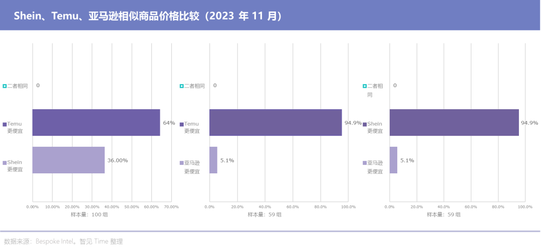 低價(jià)方面自不必多說,根據(jù) Bespoke Intel 數(shù)據(jù)顯示,超約三分之二的受訪者認(rèn)為 Temu 的價(jià)格比 Shein 便宜,當(dāng)然,超 90% 的受訪者認(rèn)為 Temu 或 Shein 上商品的價(jià)格比亞馬遜便宜。