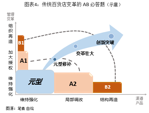 如圖表4所示,目前的行業(yè)態(tài)勢是主打A2、B2的選項,希望在授權和組織機制不變的前提下通過局部經(jīng)營內容調改、表面環(huán)境裝修改造,換取經(jīng)營利潤成果。幾年來的實踐證明,傳統(tǒng)百貨店局部升級調改很難找到成功案例。