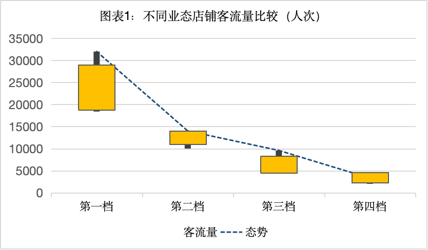 按照業(yè)態(tài)店鋪的銷售業(yè)績、客單價和客流量的統(tǒng)計比較,在店鋪經(jīng)營面積相對接近的前提下,選擇客流量、客單價變化維度,生成以下示意圖片。