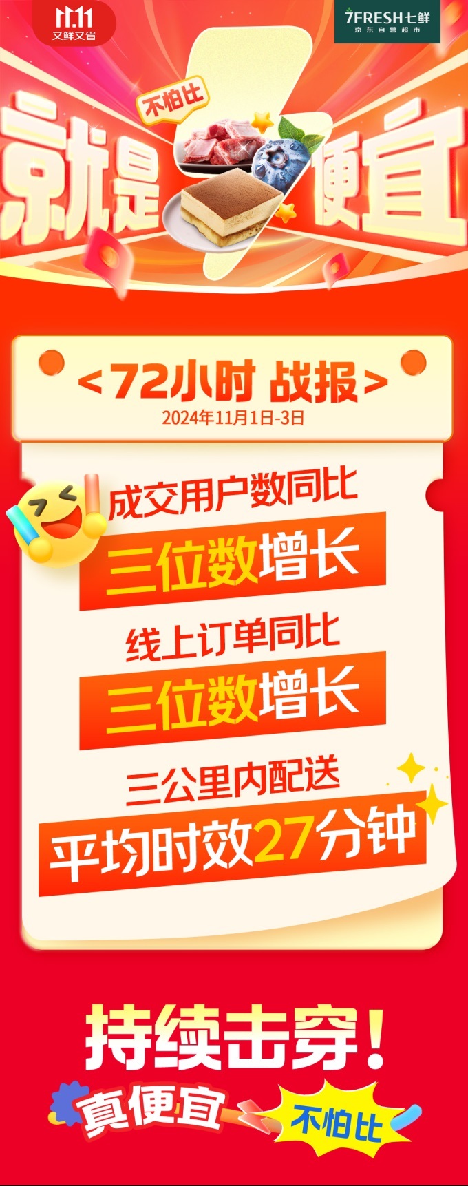 11月1日,京東七鮮超市正式開啟的“超級擊穿”活動,以“真便宜不怕比”的極致低價成功吸引海量消費者參與。僅72小時,線上訂單數(shù)、成交用戶數(shù)均實現(xiàn)同比三位數(shù)增長,水果、蔬菜、水產(chǎn)、肉禽蛋等多品類的爆款賣至脫銷。