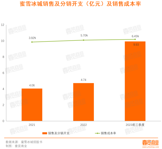 在成本控制方面,除了供應(yīng)鏈成本,銷售及分銷開支也是一項(xiàng)重要開支。2021年—2023年前三季度,蜜雪冰城的銷售及分銷開支分別為4.06億、7.74億、9.93億,銷售成本率分別為3.92%、5.70%、6.45%。