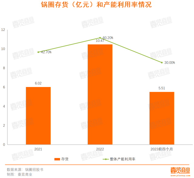 值得注意的是,鍋圈的產(chǎn)能利用率在2022年有一個(gè)明顯的跳漲,當(dāng)年存貨量也達(dá)到10.47億元,同比上漲73.92%。而2023年前四個(gè)月,鍋圈的存貨量下降至5.51億元。一位在八大工作的審計(jì)師告訴壹覽商業(yè),正常經(jīng)營的情況下,企業(yè)的產(chǎn)能利用率和存貨不會(huì)出現(xiàn)如此大的波動(dòng),鍋圈出現(xiàn)這一現(xiàn)象,很可能是因?yàn)?022年生產(chǎn)的商品多,但銷售不暢造成的。