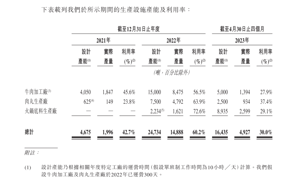 但是,從招股書的數(shù)據(jù)看,盡管鍋圈核心的自有生產(chǎn)加工廠面積以及整體設(shè)計(jì)產(chǎn)能均不小,但主要工廠的實(shí)際利用率并不高。這不僅意味著企業(yè)的生產(chǎn)效率有待提升,同時(shí)也從側(cè)面反映出終端銷售的乏力。截至2022年,牛肉加工廠、肉丸生產(chǎn)廠、火鍋底料生產(chǎn)廠的產(chǎn)能利用率分別為56.5%、63.9%、72.6%。