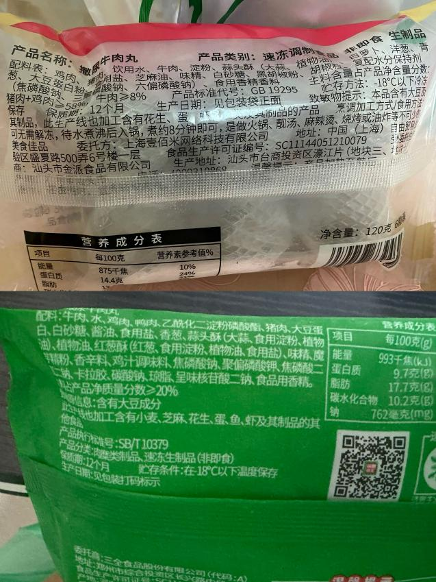 從配料表看,鍋圈的牛肉丸含有牛肉、水、雞肉、乙;矸哿姿狨ァ⒋蠖沟鞍、呈味核苷酸二鈉等26種原料,叮咚買菜的牛肉丸則含有牛肉、水、焦磷酸鈉等20種原料。鍋圈添加的成分明顯多于叮咚買菜,而且還添加了雞肉。此外,叮咚買菜在配料表上明確標(biāo)注了其牛肉占比,但鍋圈模糊了這一信息。