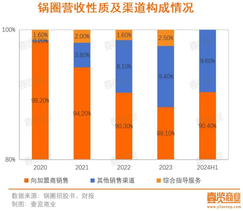 2020年至2022年,鍋圈通過向加盟商銷售產(chǎn)品分別獲得29.10億元、37.28億元、64.77億元營收,財(cái)報(bào)顯示,2023年和2024年上半年,鍋圈通過向加盟商銷售產(chǎn)品分別獲得53.66億元、23.38億元,占產(chǎn)品銷售收入的90%以上、總營收85%以上。