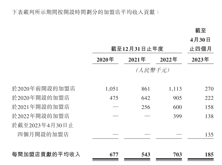 一是關(guān)于門店運(yùn)營的核心數(shù)據(jù)。招股書曾詳細(xì)披露了加盟門店與自營門店的收入貢獻(xiàn),即加盟商的進(jìn)貨量和自營店的營收。招股書顯示,2020年至2022年,加盟店年均平均收入分別為67.7萬元、54.3萬元、70.3萬元,2023年前4個(gè)月的平均收入為18.5萬元。2023年前4個(gè)月,6家自營門店總收入為300萬。