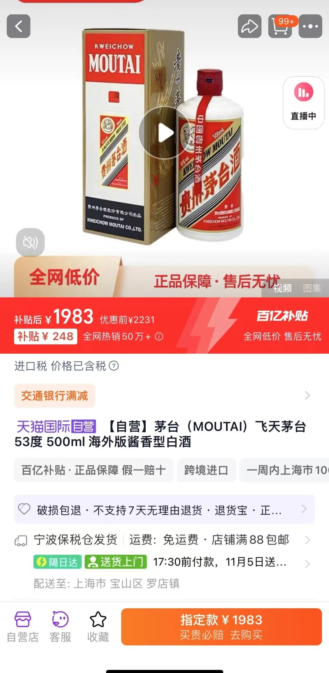最近,筆者注意到,線上飛天茅臺(tái)酒的價(jià)格已跌破2000。11月3日,在淘寶百億補(bǔ)貼頻道,53度500ml的飛天茅臺(tái)酒最新價(jià)格為1983元/瓶。更令人咋舌的是,該平臺(tái)頁面顯示,這款高端白酒已銷售超過50萬件。