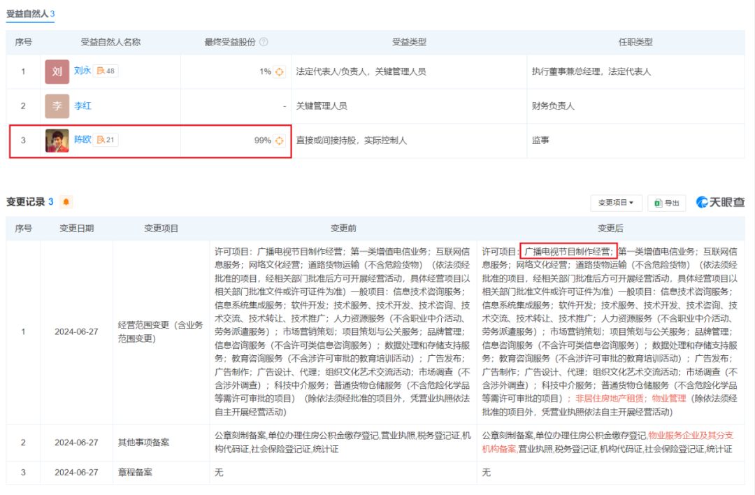 值得注意的是,APP上的營業(yè)執(zhí)照顯示運(yùn)營公司為北京科新,而根據(jù)天眼查顯示,北京科新由陳歐持股99.9%,劉永持股0.1%。