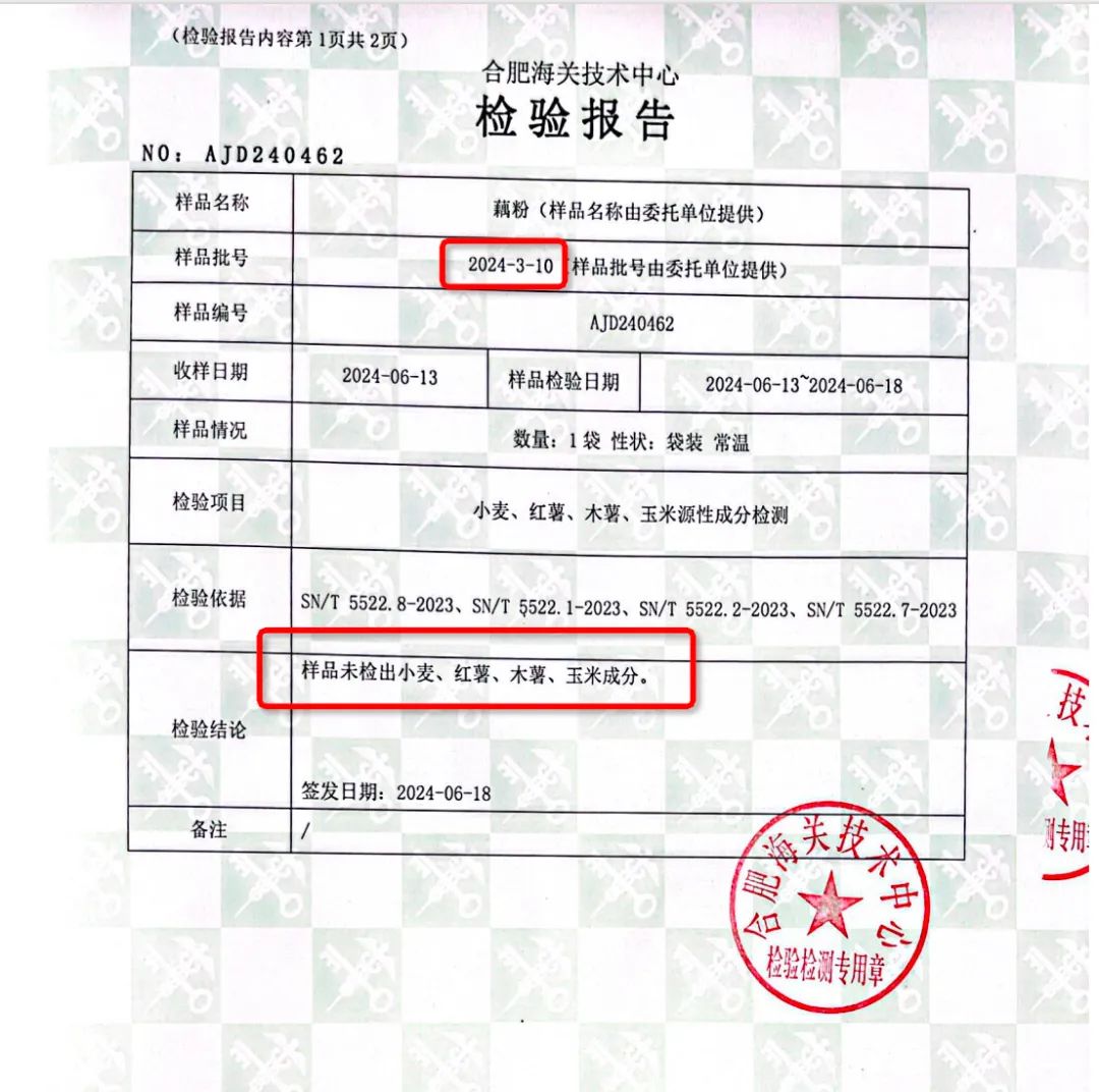 其所訴藕粉分別于2024年6月、7月、9月送檢不同的檢測(cè)機(jī)構(gòu),進(jìn)行包括特定基因成分鑒定在內(nèi)的多項(xiàng)檢驗(yàn),檢驗(yàn)結(jié)論:未檢出木薯成分。