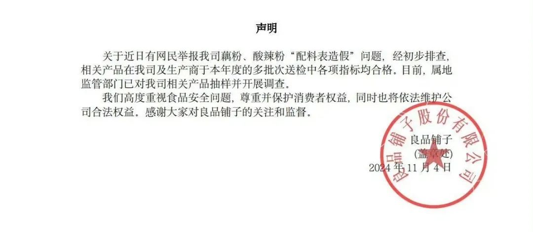 11月4日,良品鋪?zhàn)庸俜桨l(fā)布公告表示,經(jīng)初步排查,相關(guān)產(chǎn)品在我司及生產(chǎn)商本年度的多批次送檢中各項(xiàng)指標(biāo)均合格。目前屬地監(jiān)管部門已對(duì)我司相關(guān)產(chǎn)品抽樣開(kāi)展調(diào)查。