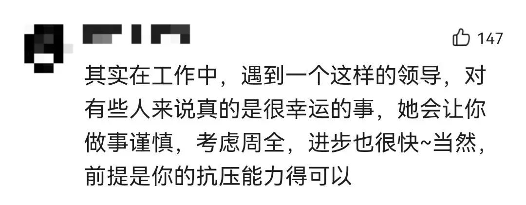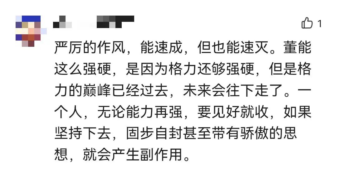 董明珠的態(tài)度和行事風格也再次引發(fā)熱議,有網(wǎng)友認為,“鏡頭前被兇,打工人太慘了。”還有人表示,“嚴厲的作風,能速成,也能速滅。一個人,無論能力再強,要見好就收,如果堅持下去,固步自封甚至帶有驕傲的思想,就會產(chǎn)生副作用!辈贿^也有人認為,“其實在工作中,遇到一個這樣的領導,對有些人來說真的是很幸運的事,她會讓你做事謹慎,考慮周全,進步也很快。當然,前提是你的抗壓能力得可以!