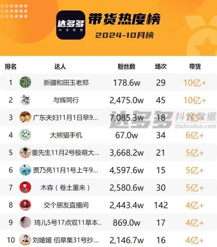 現(xiàn)在的東方甄選確實面臨著挑戰(zhàn)。雙11大促正如火如荼地進行中,據(jù)達多多出爐的10月帶貨熱度榜顯示,珠寶賽道垂類主播“新疆和田玉老鄭”以29場、超10億元的帶貨額問鼎10月帶貨榜首、與輝同行排名第二、廣東夫婦排名第三。而東方甄選未進前十。