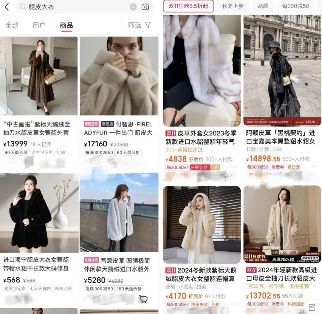 電商平臺(tái)出售的貂皮大衣 圖源:小紅書(shū)(左)、淘寶(右)
