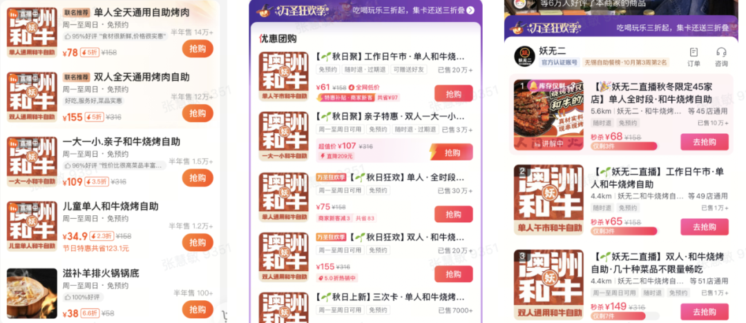 妖無二還通過直播間秒殺等營銷工具做階梯定價,實現了更多顧客的留存。以妖無二的單人全天自助餐為例,其門店POI貨架為75元,新客減3元,而直播間的秒殺為68元。妖無二利用新客優(yōu)惠實現拉新的同時,在直播間用更實惠的價格實現顧客復購。