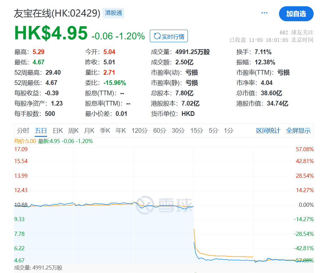 截至今日收盤,友寶在線報(bào)4.95港元/股,跌1.2%,市值僅剩下38.6億港元。而在11月4日,友寶在線上市滿一周年的解禁首日,其股價(jià)跌幅達(dá)53.53%,收盤價(jià)為5.01港元。