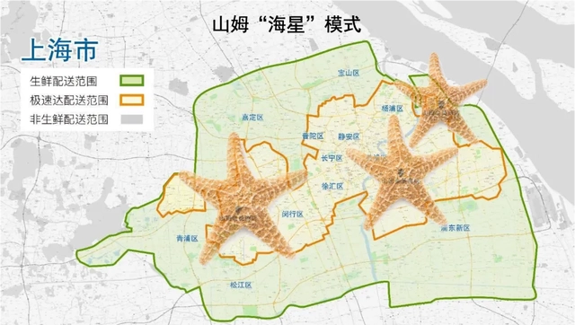 本地化方面,山姆中國(guó)以“大店+前置倉”的海星模式,滿足顧客的即時(shí)需求。其在中國(guó)目前已設(shè)立50家大店以及500家前置倉,線上占比達(dá)到一半。