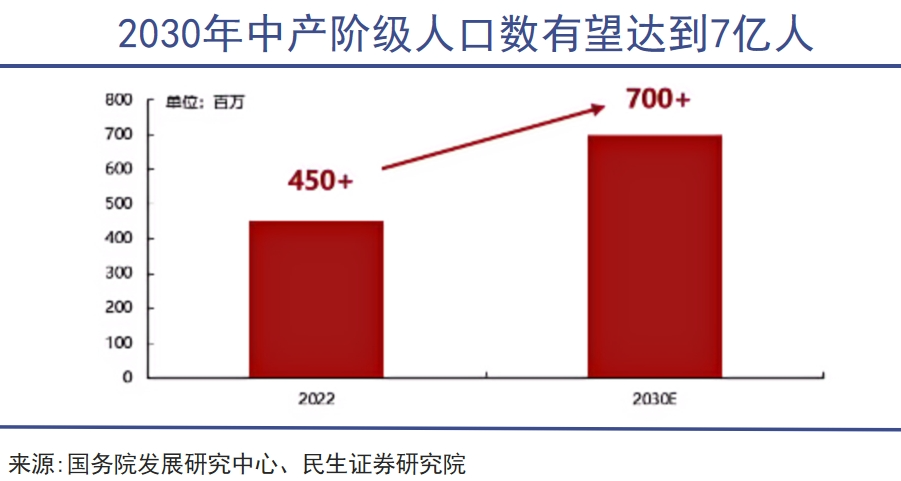 根據(jù)國(guó)務(wù)院發(fā)展研究中心預(yù)測(cè),我國(guó)中產(chǎn)階級(jí)人口有望從 2022 年的4.5億人提升至2030年的7億人,未來還有2億人群的巨大空間。