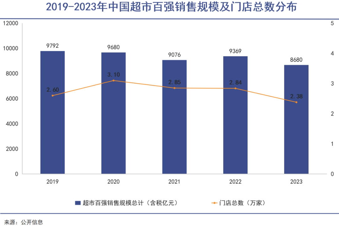 過去五年,超市百?gòu)?qiáng)銷售規(guī)模連續(xù)下滑。2023年為8680億元,僅有2019年的88%;門店數(shù)量在2020年達(dá)到3.1萬家的峰值后,到2023年跌至2.38萬家,減少近四分之一。