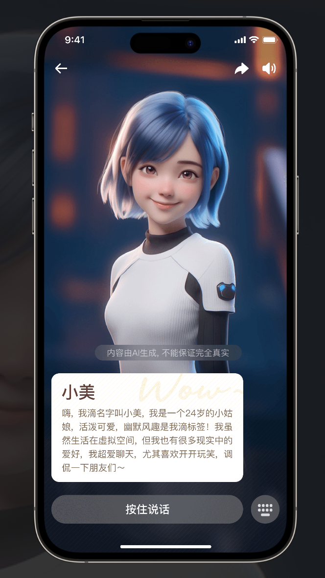 GN06的主要產(chǎn)品之一,是在2023去年11月上線的AI情感陪伴產(chǎn)品Wow。Wow是美團(tuán)在AI應(yīng)用賽道的第一個(gè)獨(dú)立產(chǎn)品,用戶可以自由定制角色形象、性格和音色,在AI社區(qū)中進(jìn)行互動(dòng)。