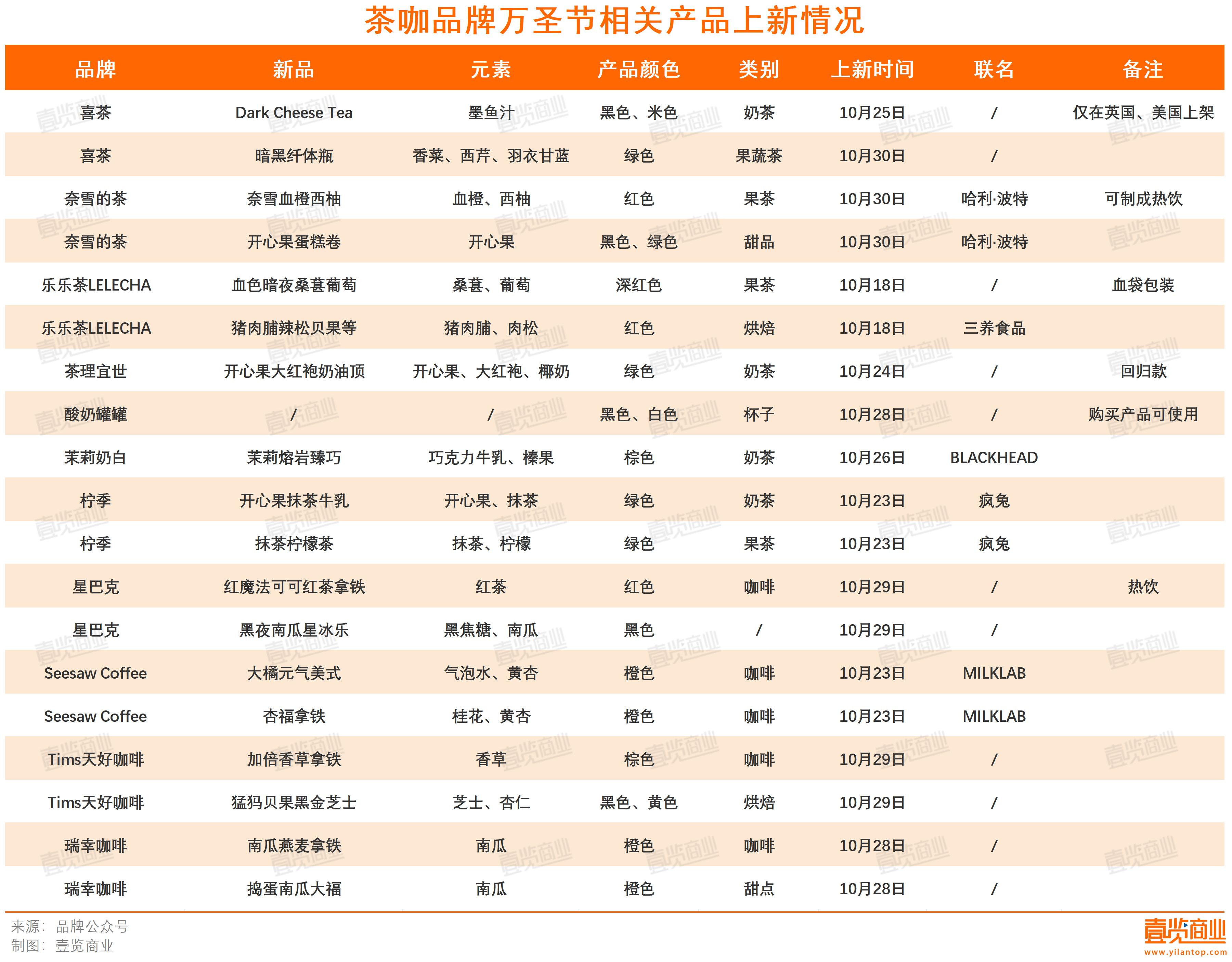 10月23日,檸季和seasaw coffee上新,且檸季與瘋兔聯(lián)名;10月24日,茶理宜世去年萬圣節(jié)爆款回歸;喜茶在海外市場(chǎng)推出限定“暗黑芝芝茶”,10月25日起在美國、英國門店上新,其中的黑色芝士奶蓋是加入墨魚汁進(jìn)行調(diào)色,10月30日,喜茶在國內(nèi)上新暗黑纖體瓶,使用香菜、西芹等原料;茉莉奶白與BLACKHEAD聯(lián)名,在10月26日推出茉莉熔巖臻巧。奈雪的茶、酸奶罐罐、星巴克、瑞幸咖啡、Tims天好咖啡則在萬圣節(jié)前四天集中上新。