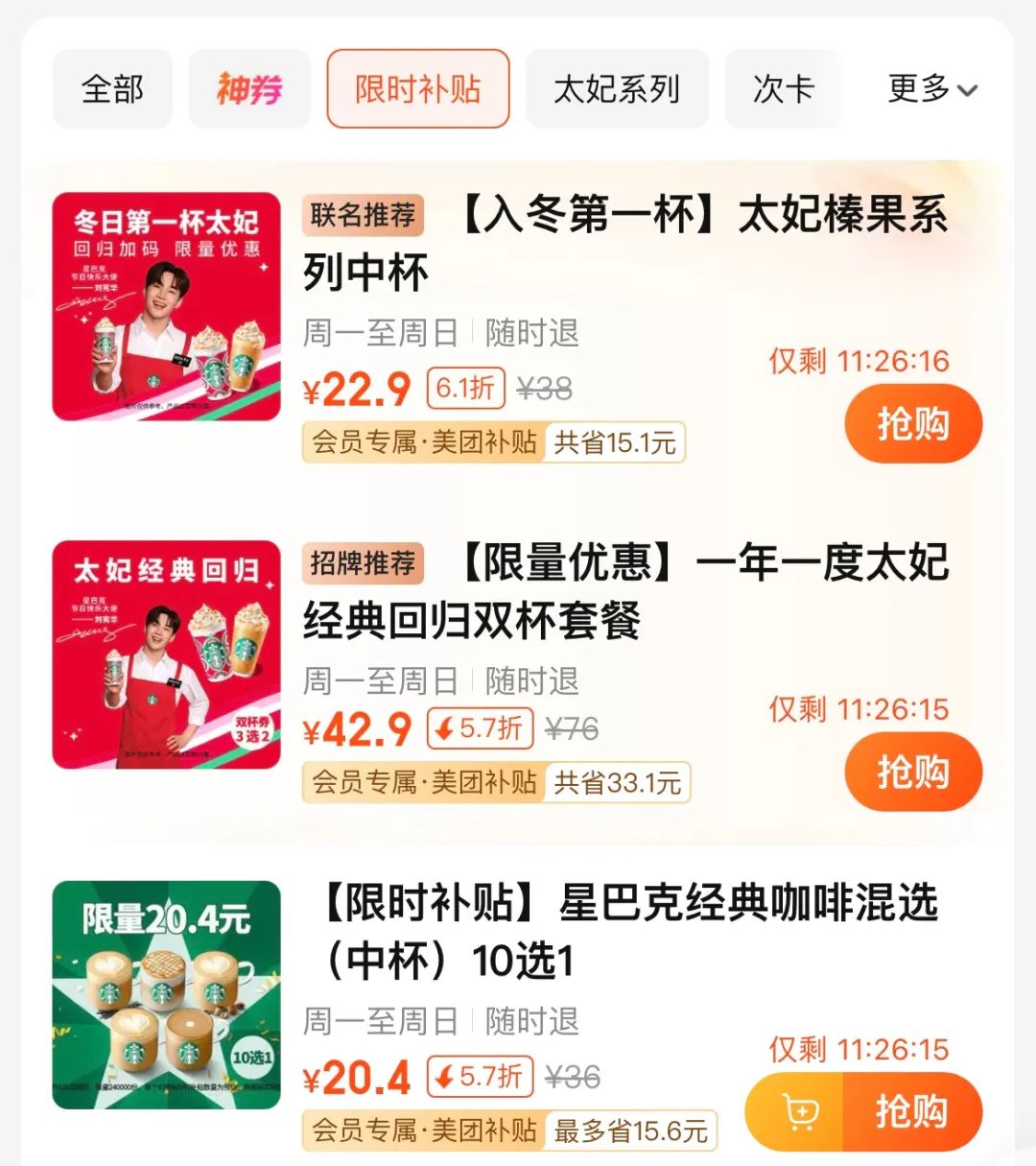 面對競爭壓力,雖然星巴克一再聲明不參與價(jià)格戰(zhàn),但星巴克對價(jià)格妥協(xié)已成事實(shí)。 今年以來,星巴克的APP和小程序時(shí)不時(shí)發(fā)放一些限時(shí)優(yōu)惠券,例如雙杯39.9元、單杯75折等。星巴克還在抖音等平臺開展直播折扣,以及在外賣平臺推出多種優(yōu)惠套餐進(jìn)行變相降價(jià),套餐價(jià)格明顯低于星巴克原價(jià)。
