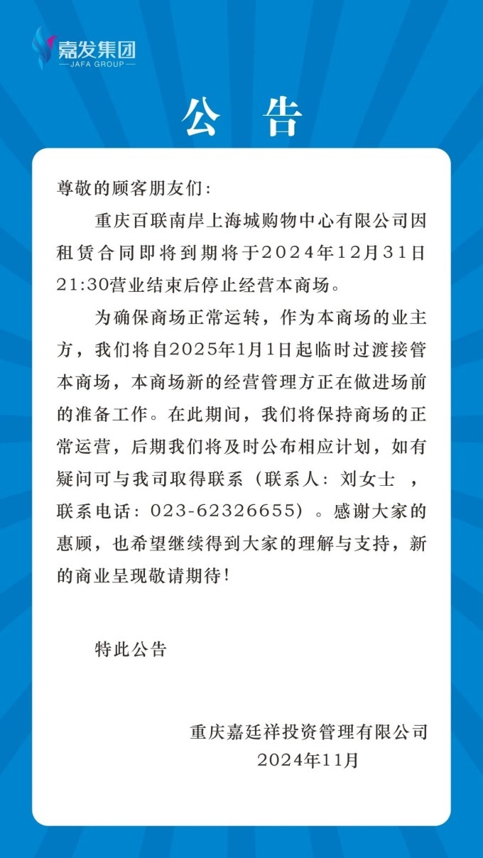 同時,商場的業(yè)主方嘉發(fā)集團(tuán)也發(fā)表了該則消息,并稱在2025年1月1日起臨時接管該商場,同時新的運(yùn)營管理方正在做進(jìn)場準(zhǔn)備。