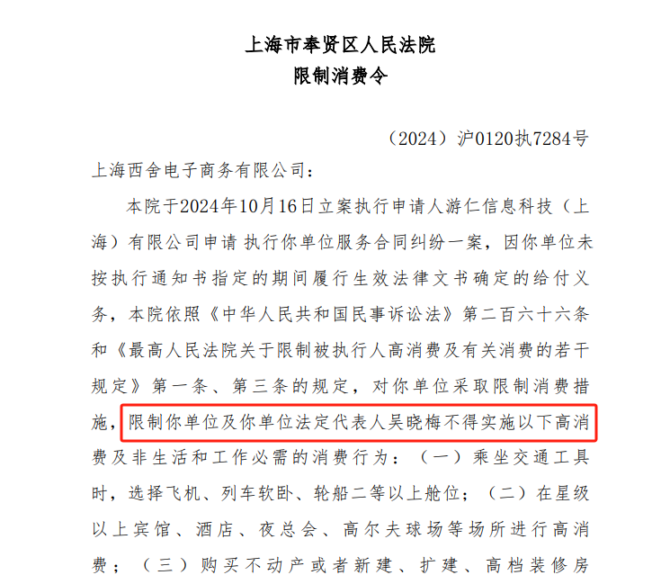 公告顯示,上海市奉賢區(qū)人民法院于2024年10月16日立案執(zhí)行申請(qǐng)人游仁信息科技(上海)有限公司申請(qǐng)執(zhí)行服務(wù)合同糾紛一案,因上海西舍未按執(zhí)行通知書指定的期間履行生效法律文書確定的給付義務(wù),對(duì)上海西舍采取限制消費(fèi)措施,包括限制單位法定代表人吳曉梅不得實(shí)施高消費(fèi)及非生活和工作必需的消費(fèi)行為。