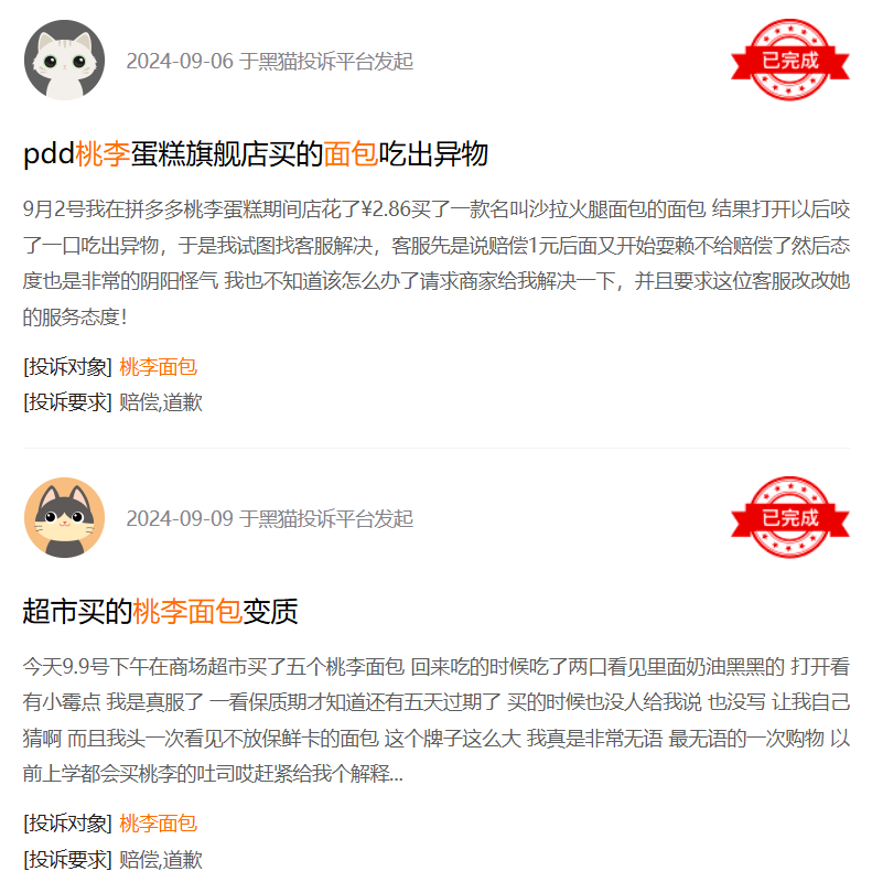 除此之外,規(guī);瘮U(kuò)張給自身帶來的問題同樣不容忽視。2023年初,有網(wǎng)友在社媒平臺(tái)聲稱自己所購買的桃李面包吃出了2~3厘米的美工刀刀片,迅速登上各大平臺(tái)熱搜榜。如今在黑貓投訴平臺(tái)上有關(guān)桃李面包的投訴量近500條,大多集中在產(chǎn)品變質(zhì)、包裝內(nèi)有異物等。