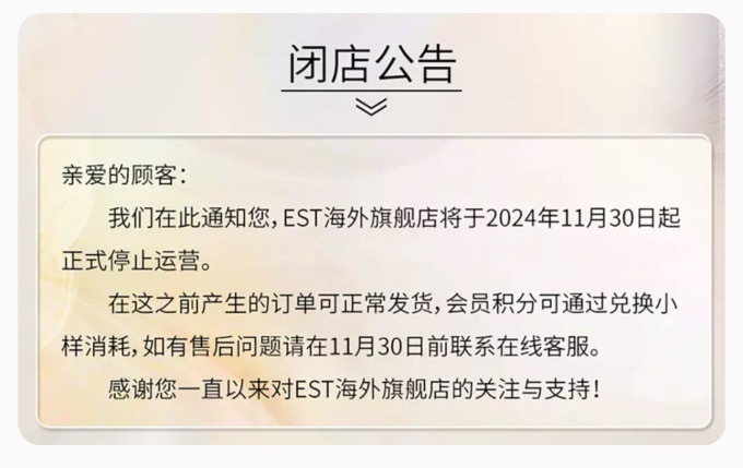 近日,花王集團旗下高端護膚品牌EST發(fā)布閉店公告,宣布天貓國際EST海外旗艦店將于2024年11月30日起正式停止運營,在這之前的訂單可正常發(fā)貨。