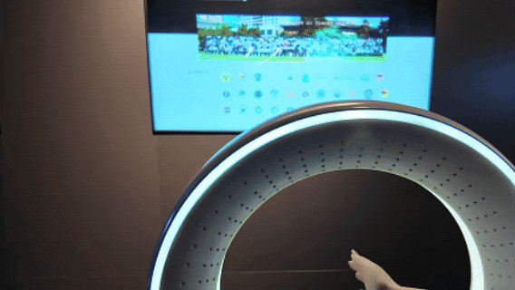 在裝置的旁邊,是一幅科技感滿滿的動(dòng)態(tài)浪潮畫(huà)卷。浪潮的流速、顏色無(wú)時(shí)無(wú)刻不在發(fā)生變化, 而影響這些的因素是金鷹大樓的電力數(shù)據(jù)、客流量等。這些數(shù)據(jù)通過(guò)編程設(shè)計(jì),結(jié)合24塊機(jī)械滑軌屏,給我們呈現(xiàn)了最終的視覺(jué)效果。往里走,有一個(gè)沉浸式裸眼3D劇場(chǎng),整個(gè)空間內(nèi)共有62臺(tái)全息投影機(jī)。