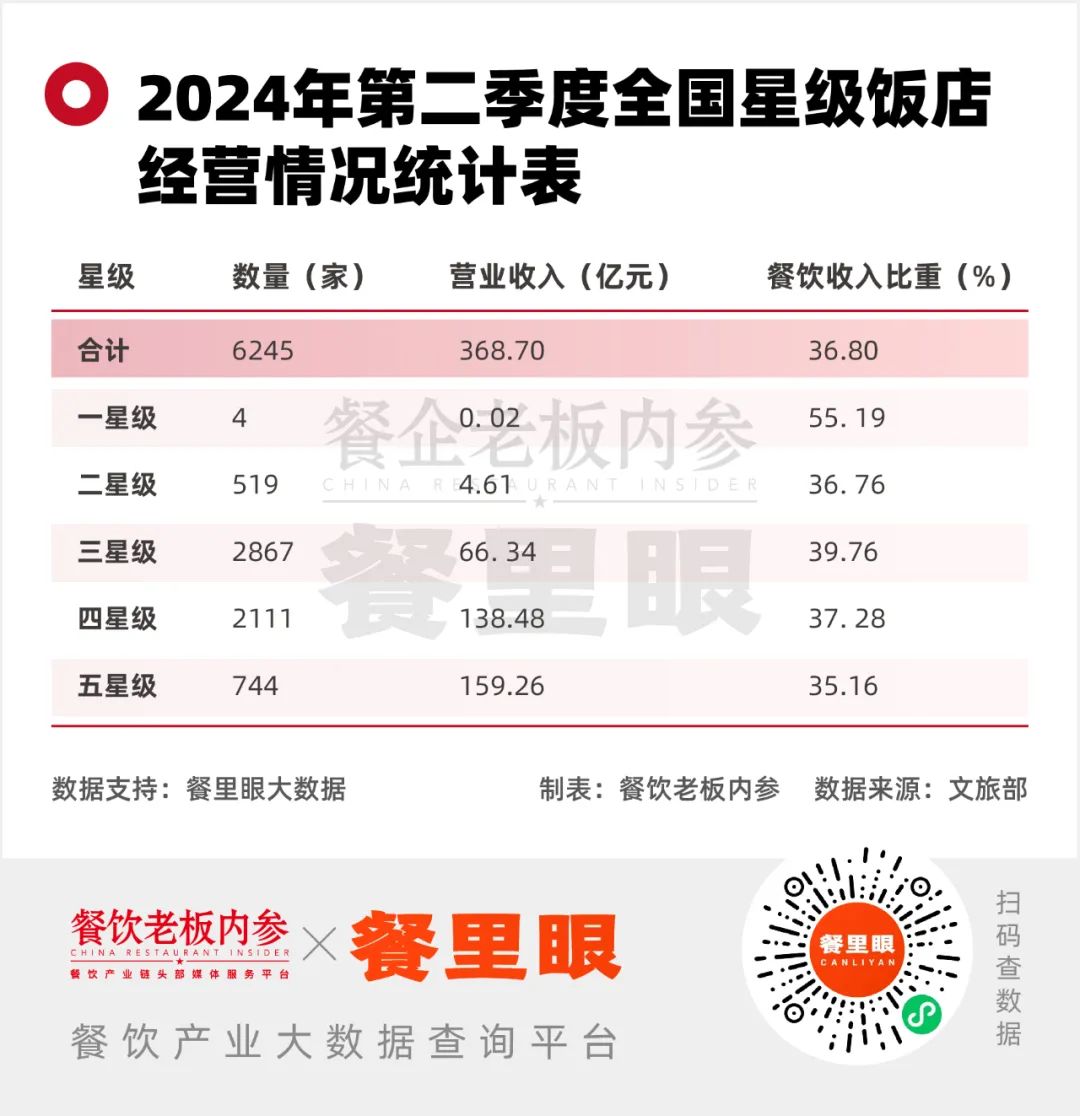 國(guó)家文旅部披露的數(shù)據(jù)顯示,2024年第二季度全國(guó)星級(jí)旅游飯店?duì)I業(yè)收入368.70億元,餐飲收入比重占36.80%。而對(duì)于一星、二星、三星級(jí)飯店,餐飲收入比重分別為55.19%、36.76%和39.76%。