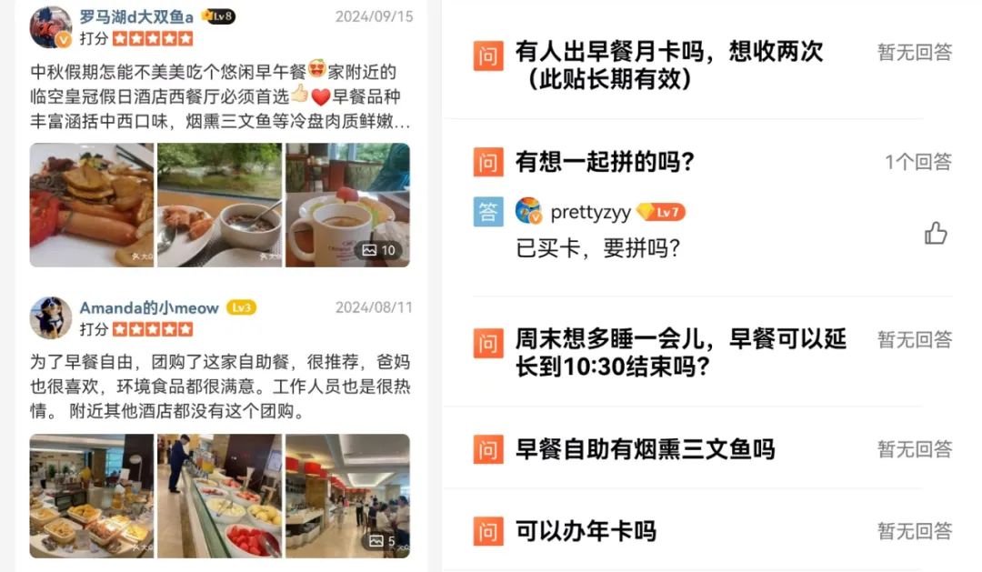在大眾點(diǎn)評(píng)的評(píng)論區(qū),不少買過(guò)早餐卡的顧客高呼“實(shí)惠”。比如北京某酒店推出自助早餐后,周邊的白領(lǐng)們一擁而上,快速把這家老牌五星吃成了“頂流網(wǎng)紅早餐廳”,甚至,有人在評(píng)論區(qū)“求拼單”,也有人嫌月卡不過(guò)癮,咨詢“能不能辦年卡”?