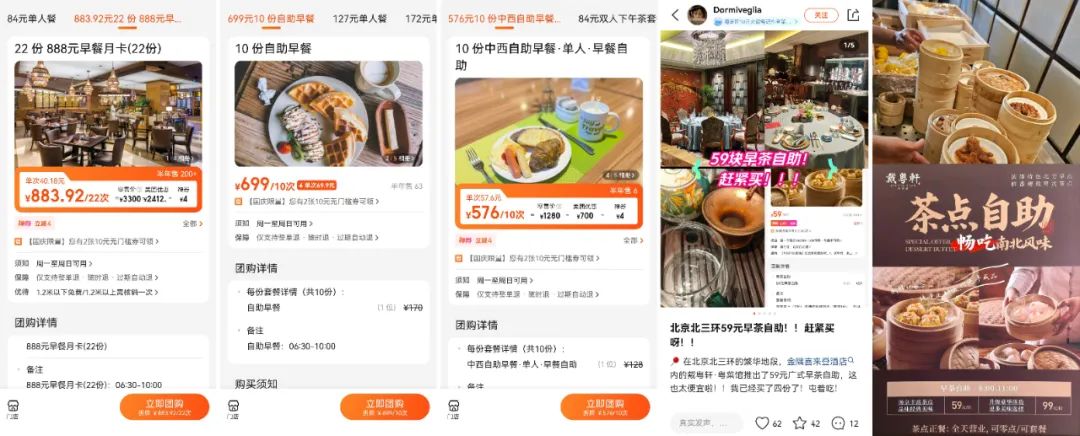 以北京為例,在北三環(huán)寸土寸金的繁華地段,金隅喜來(lái)登酒店,推出59塊早茶自助,風(fēng)格為粵式早茶,數(shù)十款茶點(diǎn)可挑選,時(shí)間可以從上午8:00吃到11:00;希爾頓歡朋酒店,推出營(yíng)養(yǎng)早餐自助,888元30次,算下來(lái)一次20多元。且購(gòu)買此套餐后,訂房也享受88折;臨空皇冠假日酒店的西餐廳,推出699元10份的自助早餐,根據(jù)網(wǎng)友評(píng)價(jià),早餐包含煙熏三文魚等餐品,甚至也有老北京的特色小吃,可謂豐富十足……