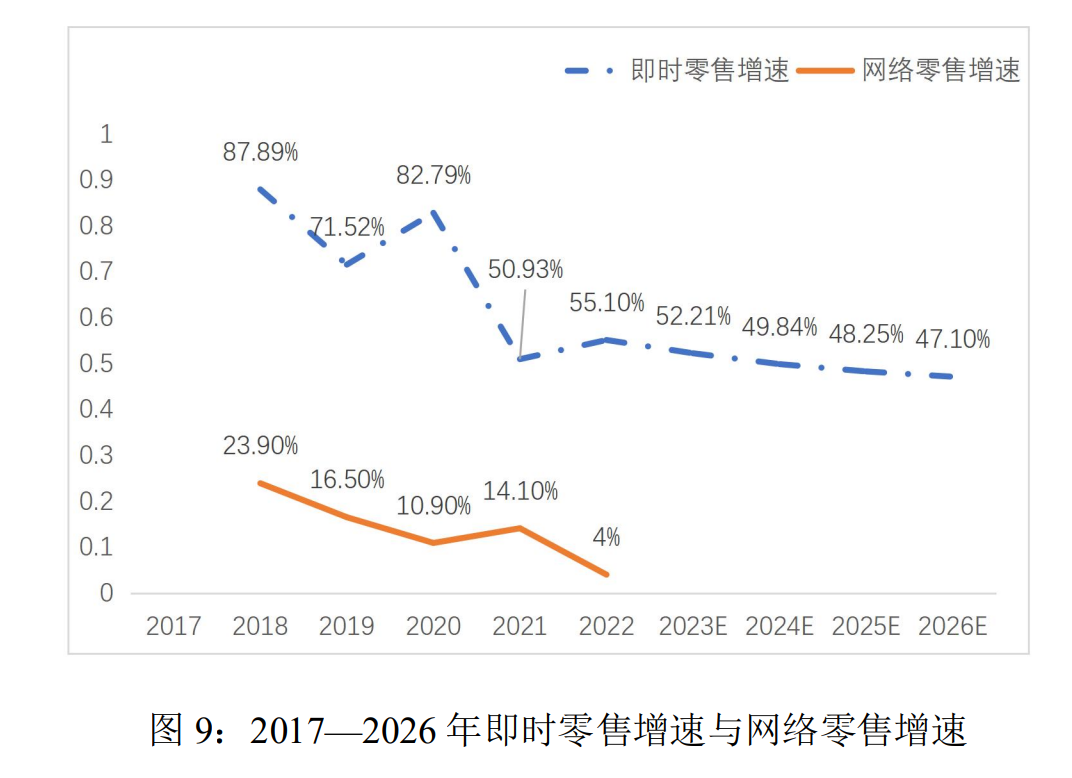 《即時零售行業(yè)發(fā)展報告(2023)》中指出,2018年以來,即時零售行業(yè)的年均增長速度超過了50%,預(yù)計到2026年,即時零售的年增長率仍然可能高達(dá)47.1%。與同期網(wǎng)絡(luò)零售總額的增速相比,2020年即時零售增速高出了71.89個百分點,2021年高出了36.83個百分點,2022年高出了51.1個百分點。