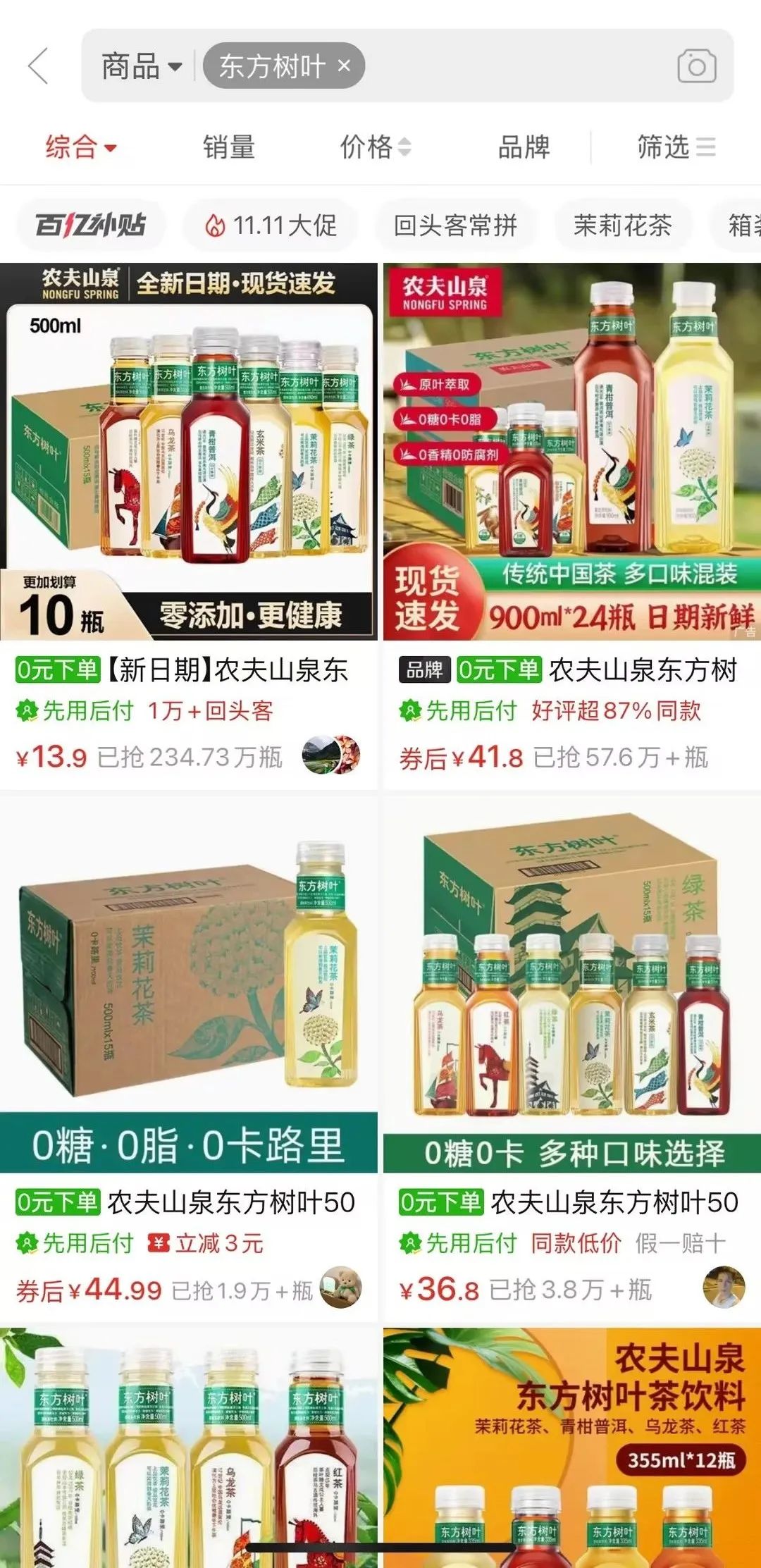 先是淘寶、拼多多、然后再抖音、快手,最后甚至連美團(tuán),幾乎每個平臺的東方樹葉價格,都有一定幅度的降價,拼多多加上百億補(bǔ)貼已經(jīng)低至1.8元,而淘寶的優(yōu)惠甚至讓500毫升的東方樹葉低至了1元以下。而許多活動甚至直接從官方渠道發(fā)出,似乎帶著某種趨勢性意味。