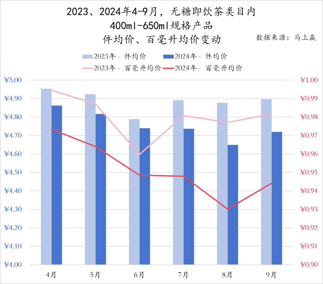 根據(jù)馬上贏的數(shù)據(jù)統(tǒng)計來看,在2024年4-9月,市場無糖即飲茶銷售額的同比增速明顯低于出貨量,反映出無糖即飲茶產(chǎn)品在規(guī)格擴(kuò)充的同時也有一定的均價下降。在400-650ml規(guī)格帶范圍內(nèi),件均價與百毫升均價同比來看均有幅度不小的下降。