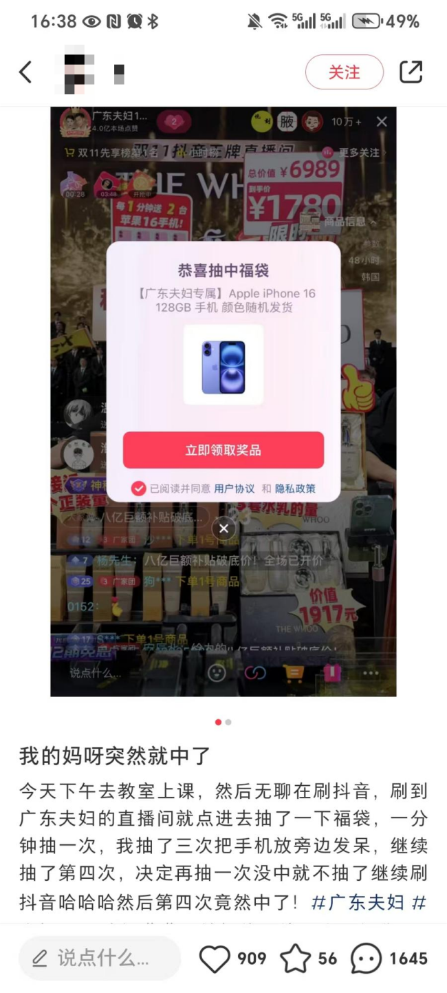 “我的媽呀突然就中了,今天下午去教室上課,無(wú)聊刷抖音,刷到直播間就隨意抽了福袋竟然中了!簡(jiǎn)直是錦鯉附體”,本是日常的好運(yùn)分享卻又掀起了一場(chǎng)新的直播間搶購(gòu)風(fēng)暴。