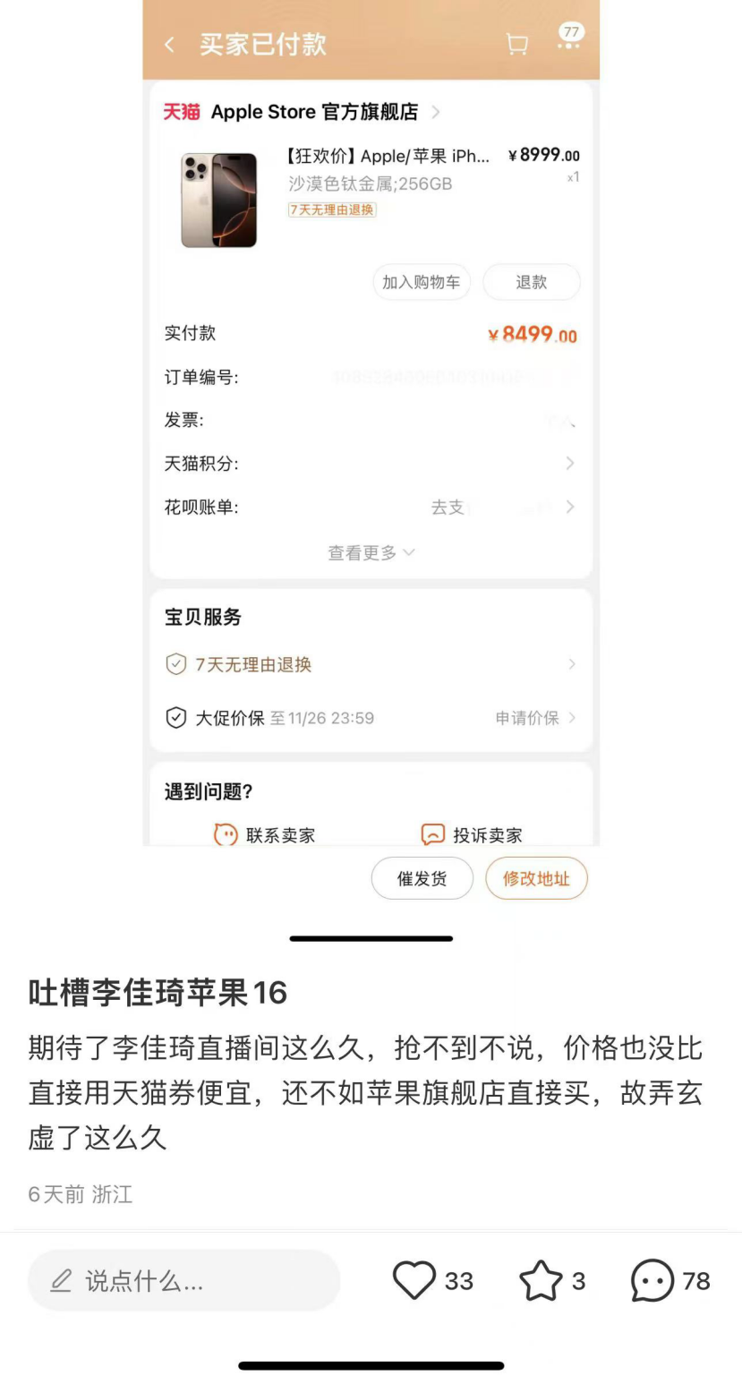 比如美ONE,即便有“所有女生”“所有女生的衣櫥”等垂類(lèi)直播間,并且對(duì)直播時(shí)段和帶貨品類(lèi)都有新的嘗試,更是減少了李佳琦本人的出鏡時(shí)長(zhǎng)與直播頻率,而消費(fèi)者對(duì)李佳琦直播間的濾鏡也漸漸在碎掉——今年雙十一,有網(wǎng)友在小紅書(shū)吐槽,李佳琦直播間的蘋(píng)果16不僅難搶?zhuān)瑑r(jià)格還不如用券之后在官方旗艦店直接買(mǎi)。