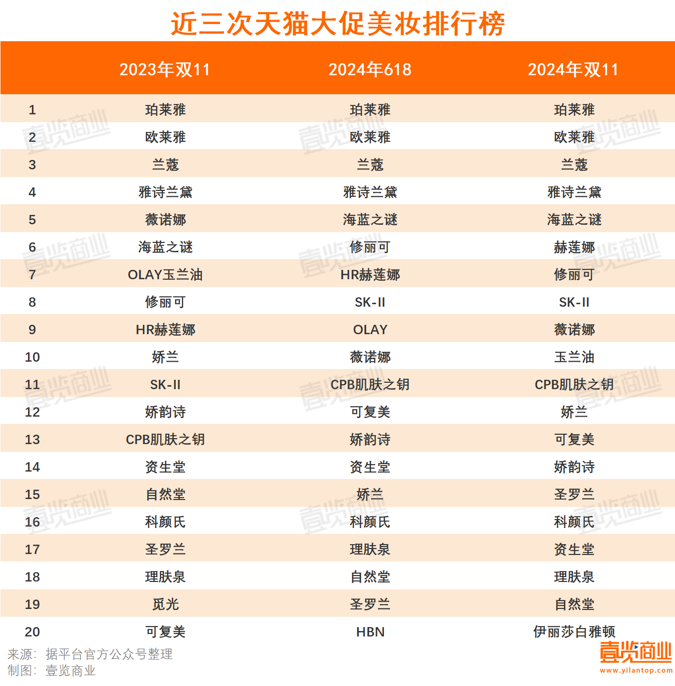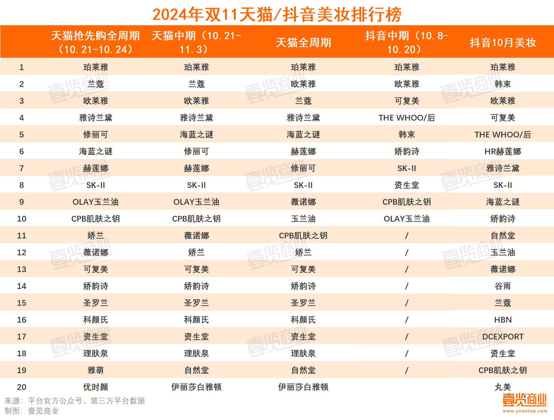 今年雙11全周期,天貓大美妝發(fā)布了多份行業(yè)榜單,抖音也首次發(fā)布官方半程榜單。總體來看,前10格局穩(wěn)定,日系品牌重新上榜。