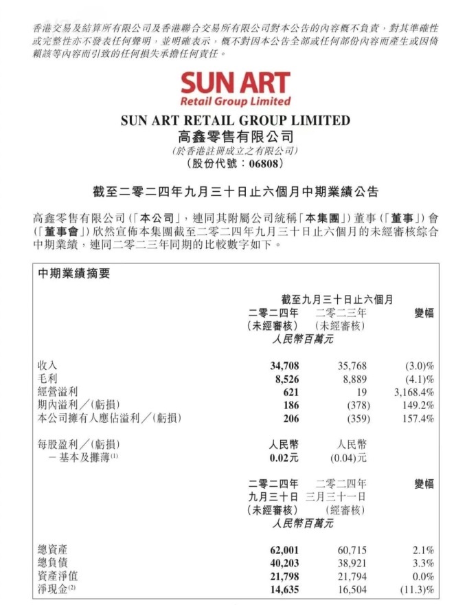 11月12日晚間,高鑫零售發(fā)布截至2024年9月30日的2025財(cái)年中期業(yè)績(jī)報(bào)告。
