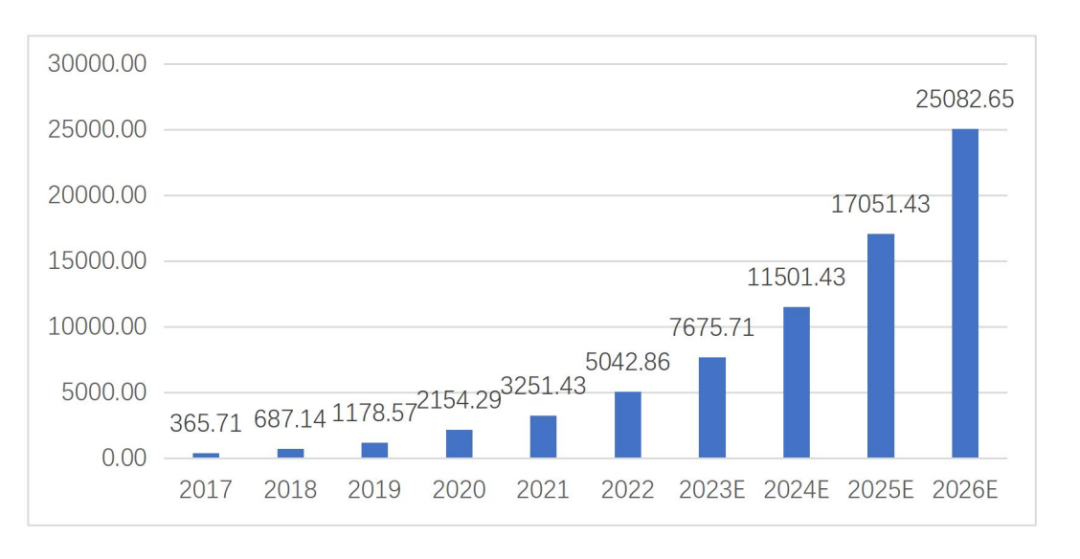 2017—2026年即時零售市場規(guī)模(單位:億元)。圖源:即時零售行業(yè)發(fā)展報告(2023)