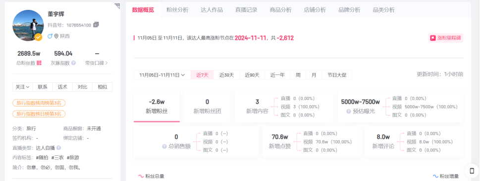 這一系列的風(fēng)波讓董宇輝的個(gè)人賬號(hào)也出現(xiàn)了掉粉情況。截至11月10日,他的抖音賬號(hào)粉絲數(shù)為2689.5萬,7天內(nèi)掉粉2.6萬。