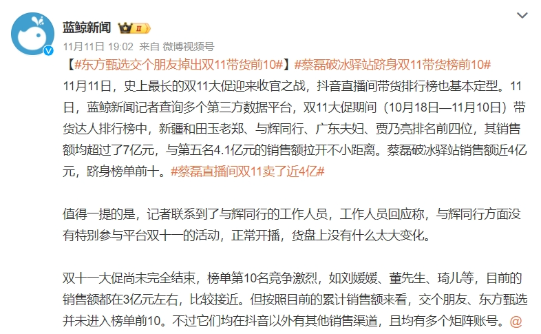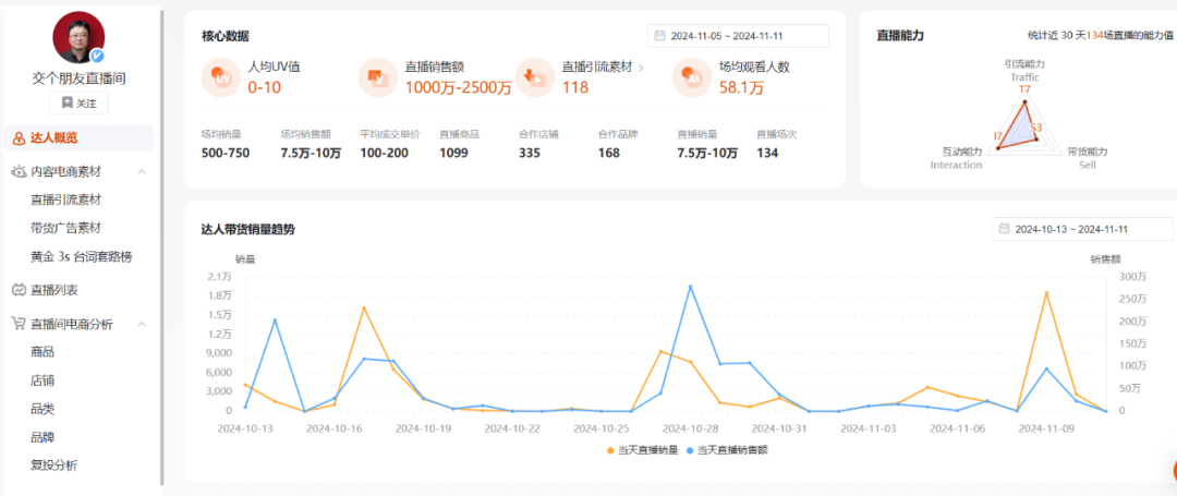 值得一提的是,在近期超頭主播頻繁“帶貨翻車”的背景下,今年“雙11”淘寶直播整體成交金額、購買用戶數(shù)均實現(xiàn)大幅度同比增長。“趣解商業(yè)”觀察到,“交個朋友”是此次為數(shù)不多仍在發(fā)布戰(zhàn)報的頭部MCN機構(gòu)。