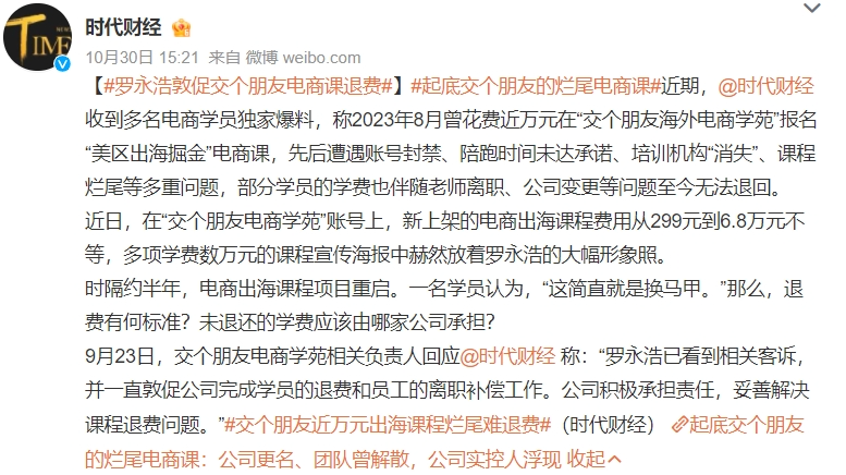最近,“交個朋友”的海外電商課就被曝出“爛尾”“無法退費”等問題。根據(jù)“時代財經(jīng)”報道,交個朋友的海外電商基礎課程299元,學員被引流至私域后還有8800元起步的客單價更高的課程。有學員表示,課程開啟30天后,大家的美區(qū)賬號先后出現(xiàn)限流、收款賬號封禁、不能掛商品鏈接等問題;而“陪跑老師”卻逐漸離職消失,課程爛尾。同時,由于“交個朋友”對海外課程業(yè)務進行調(diào)整,學員退費也變得步履維艱。