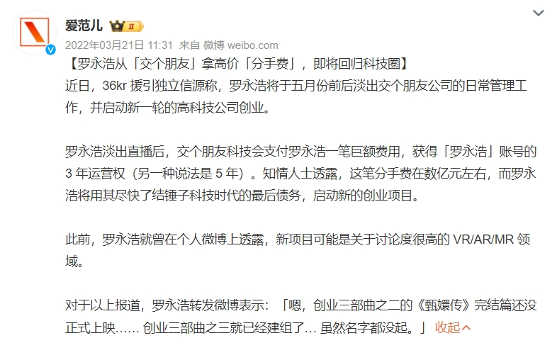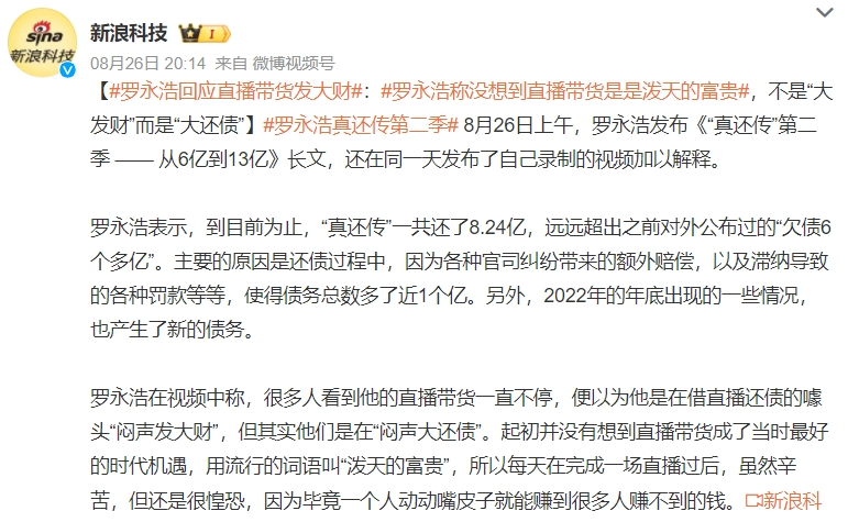 今年8月,羅永浩宣布自己已經(jīng)結(jié)束了第一回合的“真還傳”,接下來還有6億元左右國有資本債款要繼續(xù)償還,未來仍會“將通過錄制綜藝節(jié)目、接廣告和代言、請文化名流和影視明星來直播間交流和帶貨等方式,繼續(xù)還債!边@或許也是羅永浩近期直播頻率有所提升的原因之一。