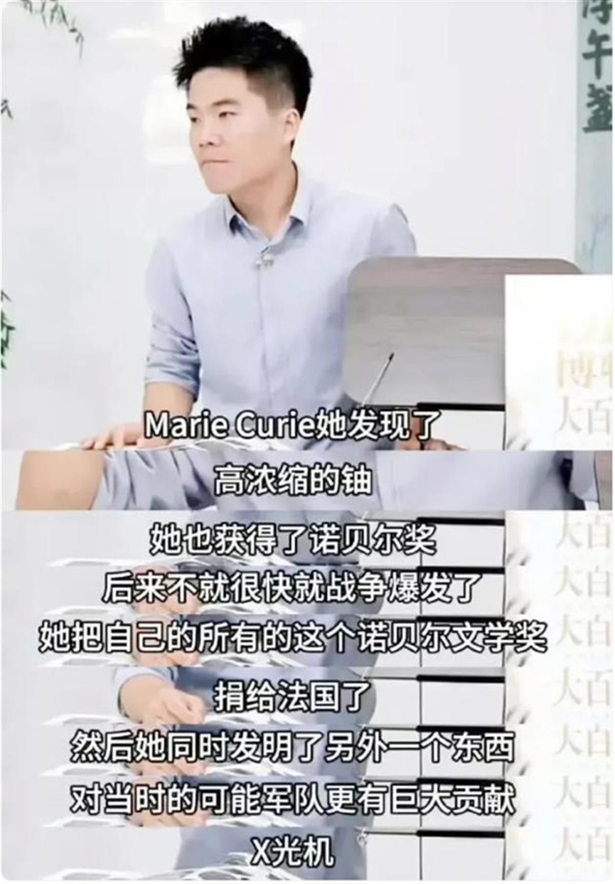 9月與輝同行開學(xué)季專場的直播中,董宇輝盤點(diǎn)歷史上偉大的女性時,特別提到了居里夫人。然而,短短幾分鐘,董宇輝就說錯了諸多知識點(diǎn):居里夫人發(fā)現(xiàn)了鈾、發(fā)明了X光機(jī)、獲得了諾貝爾獎文學(xué)獎。